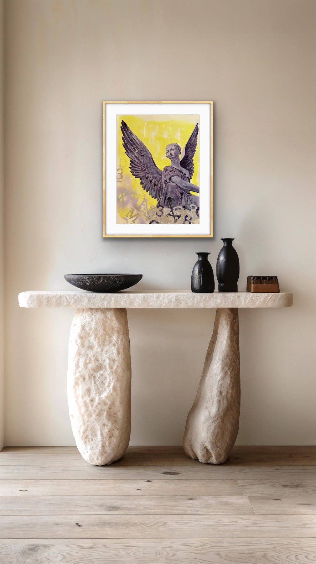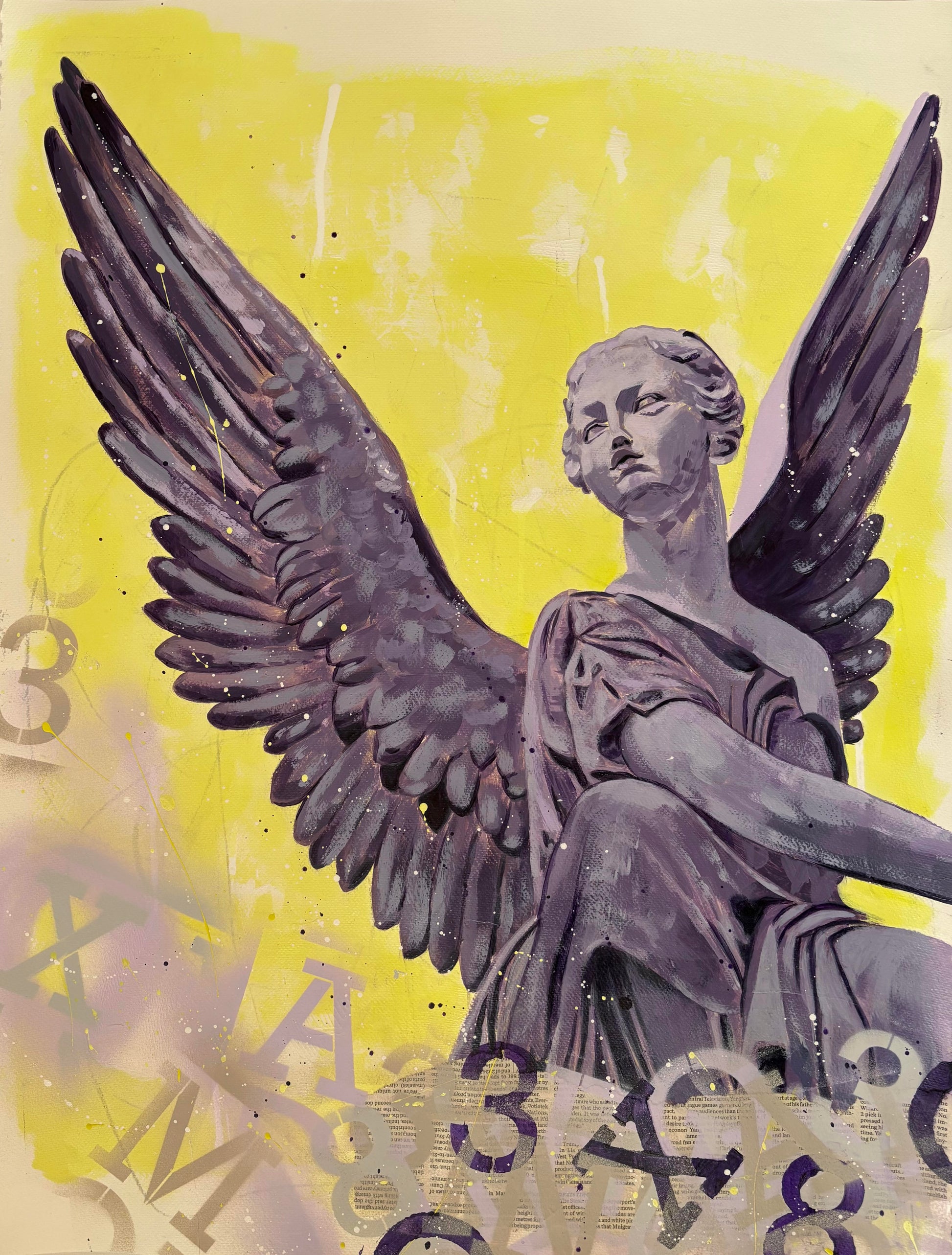 A lot of times when I’m working on a piece I get bombarded by a sureness of what I am to paint next. This angel statue with a vibrant yellow background and graffiti vibes was certain that she wanted to be born into existence, and so I listened. A special piece for a special home.