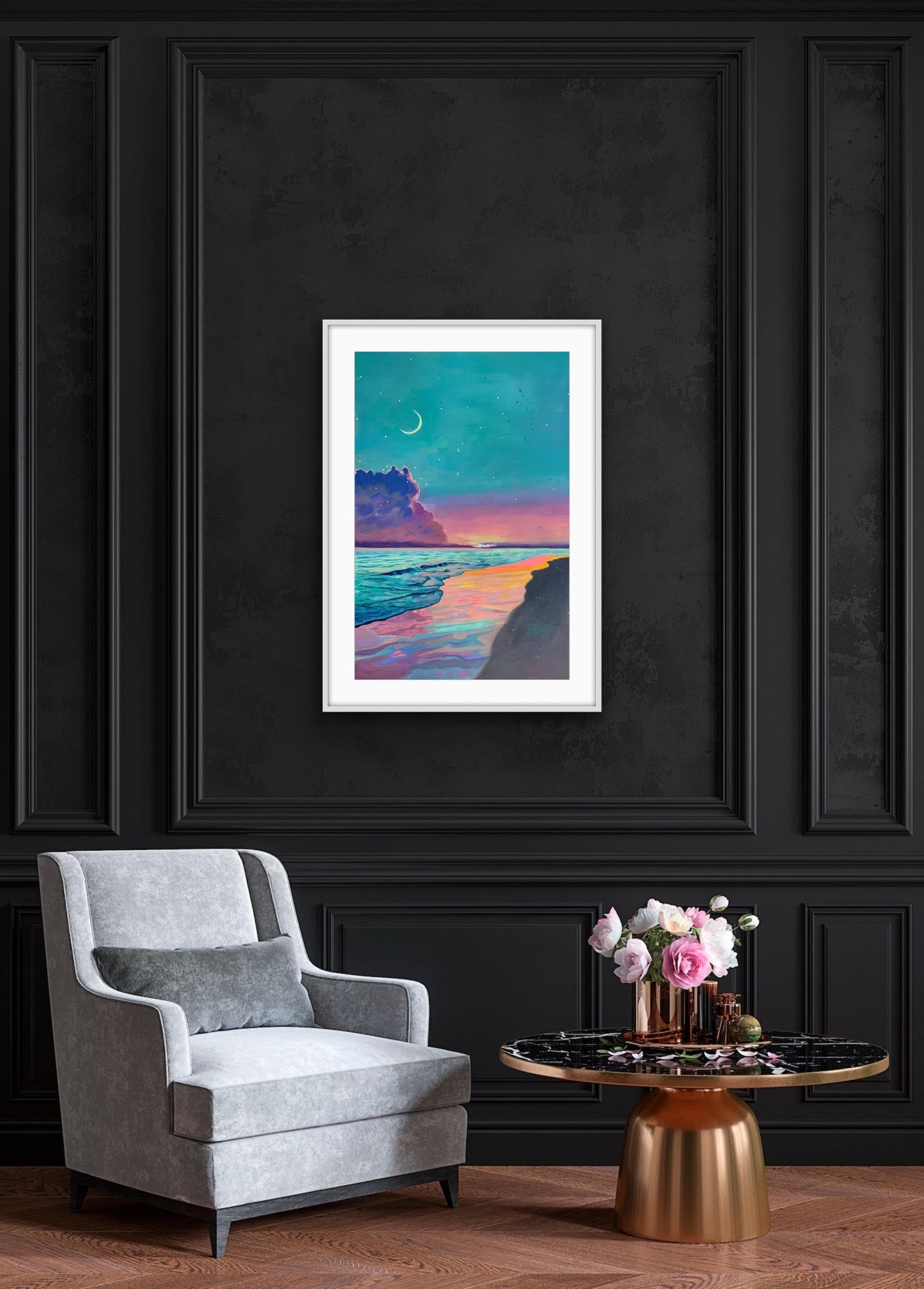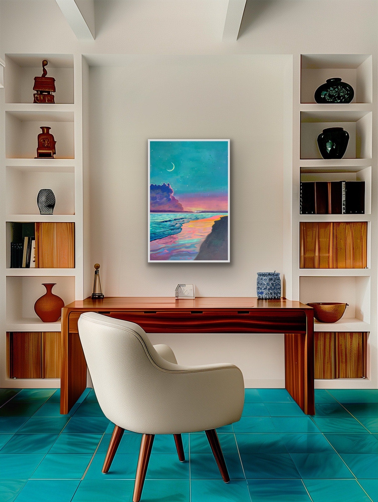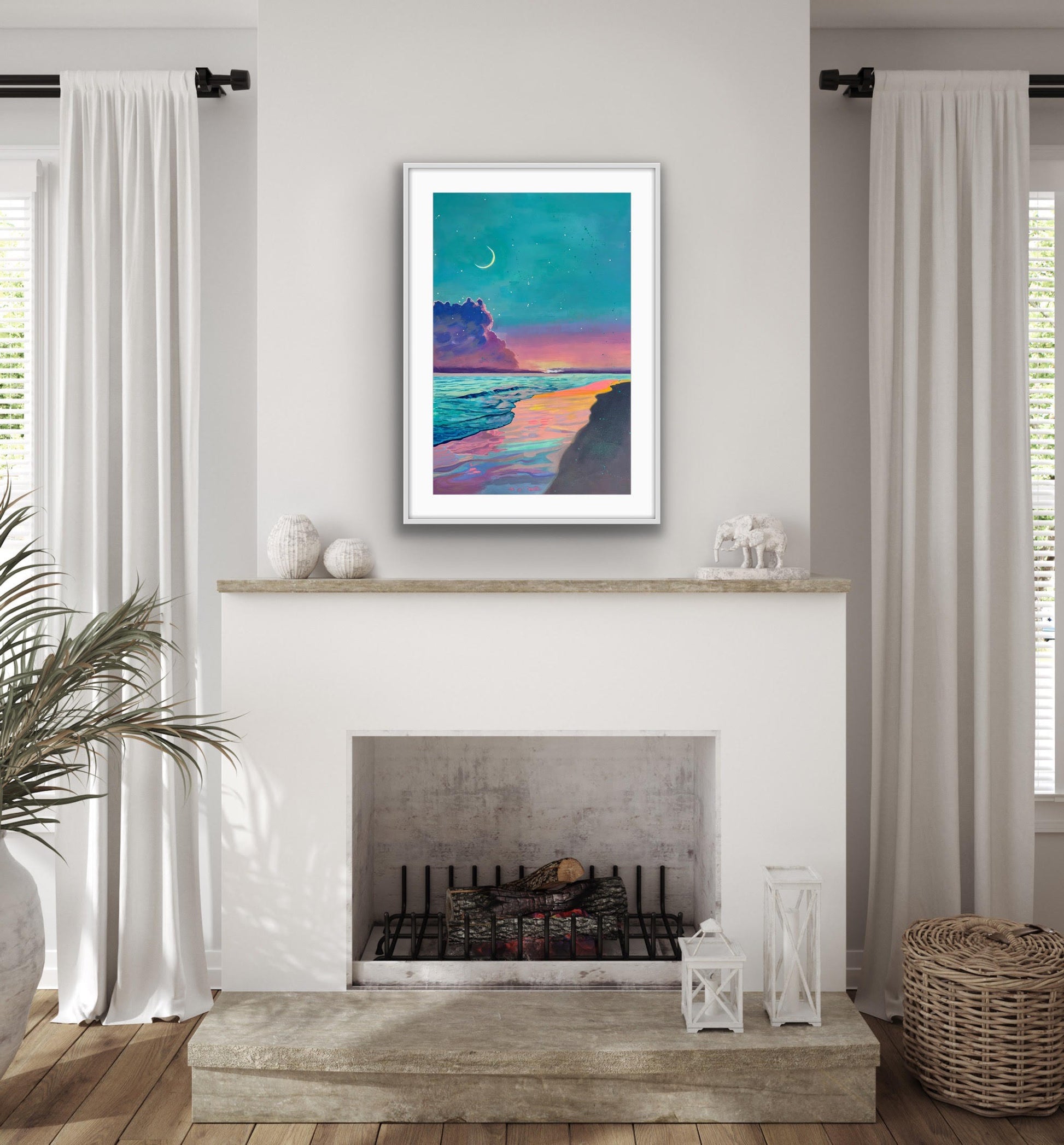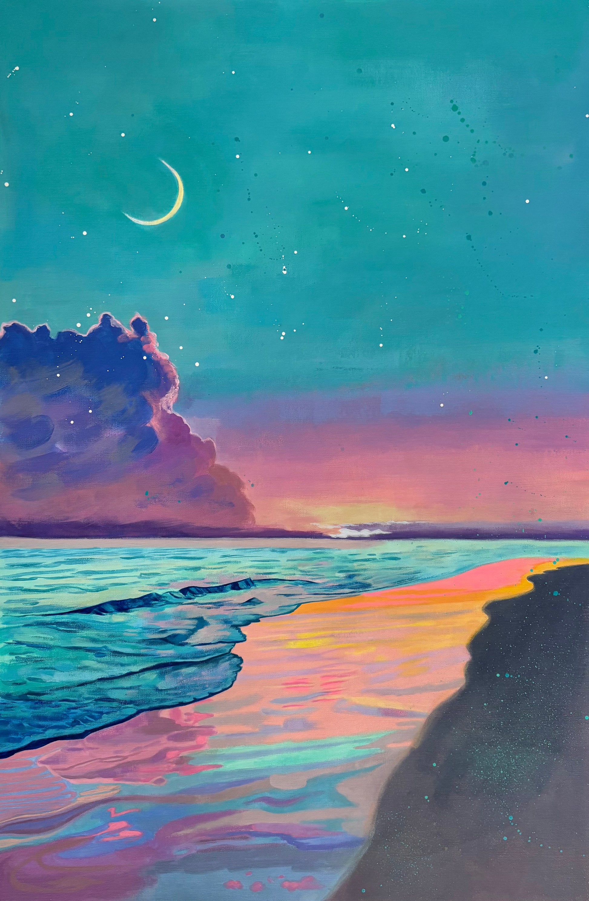 And in this moment beyond time and space it all comes together. Pastel skies, color symphony, calming ocean waters, crescent moon, colors that calm and elevate…a sea and skyscape that lights the spirit, this piece illuminates the light beyond, the light within.